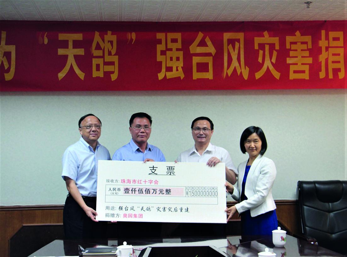 2017年,中国奥园为珠海“天鸽”强台风灾后重建捐赠1500万元